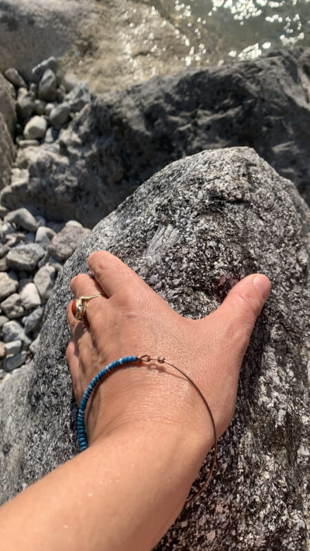 Ich vergleiche unser Inneres System gern mit einem Mobile: Hand auf einem Felsen als Symbol für Erdung und die stabile Mitte im KörperEs bewegt sich. Es wackelt. Es kommt wieder zur Ruhe.